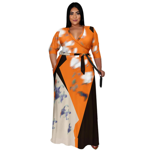 Runwind Dresses for Women Floral Maxi Dress Flowy 3/4 Sleeve with Belt Orange Black